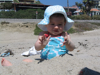 Here are some pictures from last weekend at the beach. She loved crawling through the sand. She's never been one to put things in her mouth, but lately she's been curious about everything. She loves putting sand in her mouth. Another fun find...sand in the craziest places. I remember when I was young I would find sand everywhere. She hated the ocean. We'd walk her out to the waves and as we got closer she would hold on tighter and try to climb up our bodies.